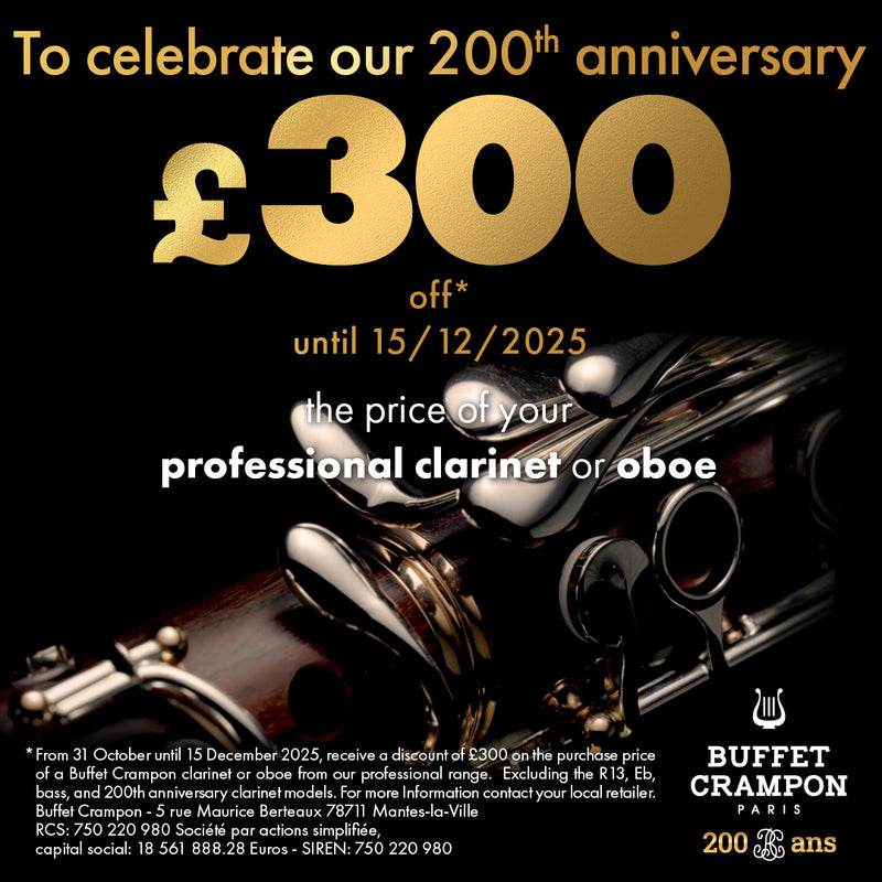 To celebrate Buffet's 200th anniversary, Buffet are offering £300 of selected clarinet and oboe models.